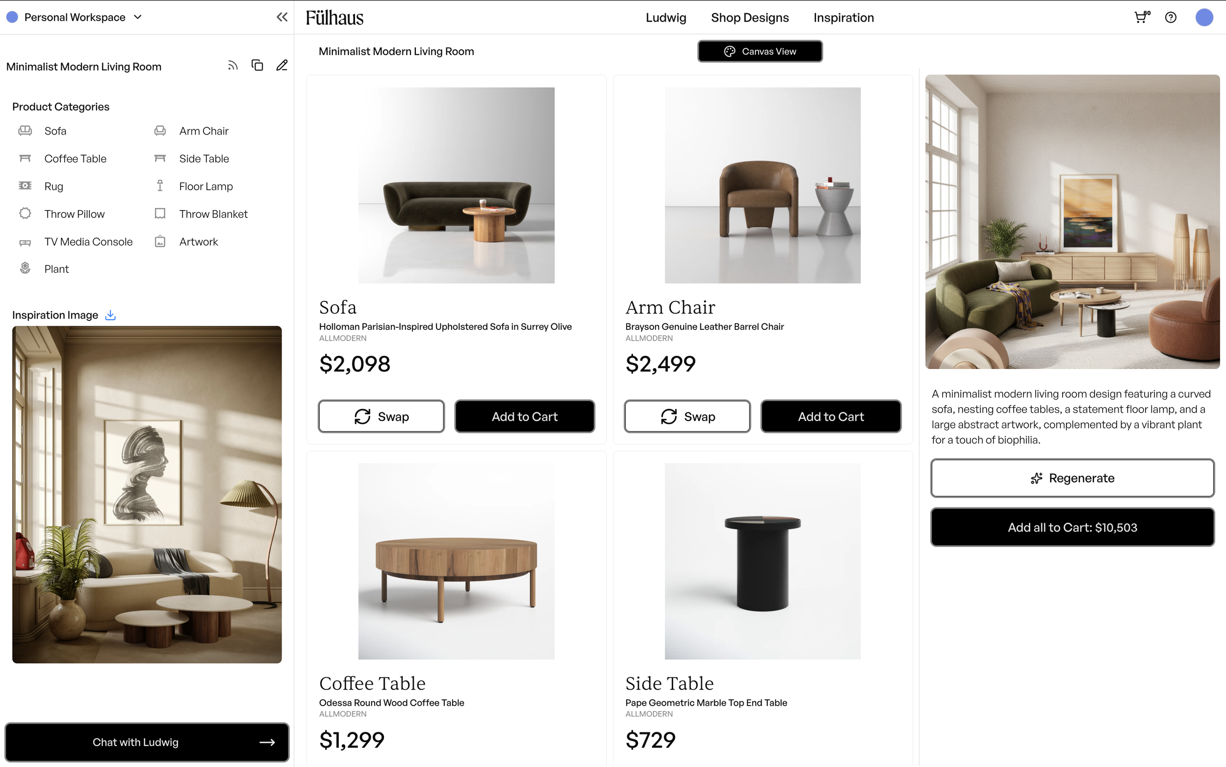 Simply upload any inspiration, and Ludwig will instantly design a furniture plan informed by your image. Order it all from one place, at the click of a button.